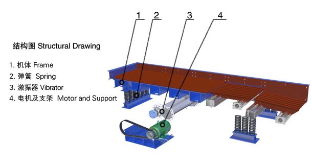 ZSW系列振動給料機是由給料槽體、激振器、彈簧支座、傳動裝置等組成。槽體振動給料的振動源是激振器,激振器是由兩根偏心軸(主、被動)和齒輪副組成,由電動機通過三角帶驅(qū)動主動軸,再由主動軸上齒輪嚙合被動軸轉(zhuǎn)動,主、被動軸同時反向旋轉(zhuǎn),槽體振動,使物料連續(xù)不斷流動,達到輸送物料的目的。