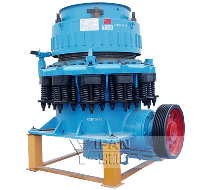 彈簧圓錐破碎機工作時,由電動機通過三角帶、大帶輪、傳動軸、小錐齒輪、大錐齒輪帶動偏心套旋轉(zhuǎn),破碎圓錐軸心線在偏心軸套的迫動下做旋轉(zhuǎn)擺動,使得破碎壁表面時而靠近又時而離開軋臼壁的表面,從而使物料在定錐與動錐組成的環(huán)形破碎腔內(nèi)不斷地受到?jīng)_擊、擠壓和彎曲而破碎。經(jīng)過多次擠壓、沖擊和彎曲后,物料破碎至要求粒度,經(jīng)下部排出。 廣泛應(yīng)用于冶金、建筑、水電、交通、化工、建材工業(yè)中, 適合破碎堅硬、中等硬度以上的各種礦石和巖石。