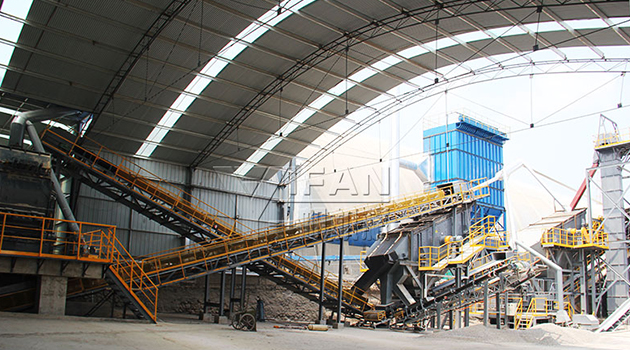 該生產(chǎn)線是鄭州一帆根據(jù)當(dāng)?shù)乜蛻羯a(chǎn)需求,自主研發(fā)設(shè)計(jì)的包含前段破碎到后段制砂的精品機(jī)制砂生產(chǎn)線(砂石同出),在一個生產(chǎn)線系統(tǒng)中加工生產(chǎn)出骨料和機(jī)制砂兩種成品。其優(yōu)勢在于,大大提高石灰石物料的利用率,降低整條生產(chǎn)線的廢料量,有效利用生產(chǎn)線廢料來提高產(chǎn)值,整個砂石同出系統(tǒng),符合國家對質(zhì)量、節(jié)能及環(huán)保的要求,實(shí)現(xiàn)了真正意義的綠色生產(chǎn)。