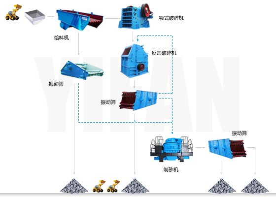 煤矸石的加工分為顎式破碎機(jī)的粗碎、反擊式破碎機(jī)或圓錐式破碎機(jī)的中細(xì)碎和制砂機(jī)的制砂整形三個(gè)階段。 第一階段:粗碎 大塊煤矸石經(jīng)料倉(cāng)由振動(dòng)給料機(jī)均勻喂料,輸送到顎式破碎機(jī)進(jìn)行粗碎,粗碎后的煤矸石經(jīng)振動(dòng)篩篩分后,由皮帶輸送機(jī)輸送至反擊式破碎機(jī)或圓錐破碎機(jī)進(jìn)行中細(xì)碎。 第二階段:中細(xì)碎 輸送到反擊破/圓錐破中的煤矸石經(jīng)過中細(xì)碎后,利用圓振篩進(jìn)行篩分,較大顆粒的煤矸石返送到反擊破/圓錐破再次破碎。 第三階段:制砂 將破碎后的煤矸石送入制砂機(jī)進(jìn)行進(jìn)一步破碎整形,如需潔凈的煤矸石,可送入洗砂機(jī)清洗。