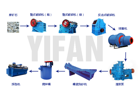 銅礦選礦生產(chǎn)線一般采用比較簡單的流程,經(jīng)一段磨礦,細(xì)度-200網(wǎng)目約占50%~70%,1次粗選,2~3次精選,1~2次掃選。如銅礦物浸染粒度比較細(xì),可考慮采用階段磨選流程。處理斑銅礦的選礦廠,大多采用粗精礦再磨—精選的階段磨選流程,其實質(zhì)是混合—優(yōu)先浮選流程。先經(jīng)一段粗磨、粗選、掃選,再將粗精礦再磨再精選得到高品位銅精礦和硫精礦。粗磨細(xì)度-200網(wǎng)目約占45%~50%,再磨細(xì)度-200網(wǎng)目約占90%~95%。 銅礦選礦流程分為三部分: 1.破碎部分:粉碎礦石過程的基本過程。其目的是原礦粉碎到適當(dāng)大小,適合用于研磨一部分。? 2.研磨部分:研磨粉碎部分進(jìn)一步處理礦石得到更小的尺寸是為配合浮選分離材料? 3.浮選部分:浮選過程/升級銅礦的重要過程?;瘜W(xué)試劑將被添加到混頻器/攪拌機,使化學(xué)反應(yīng)。 開采的礦石先由顎式破碎機進(jìn)行初步破碎,在破碎至合理細(xì)度后經(jīng)由提升機、給料機均勻送入球磨機,由球磨機對礦石進(jìn)行破碎、研磨。 經(jīng)過球磨機研磨的礦石細(xì)料進(jìn)入下一道工序:分級。螺旋分級機借助固體顆粒的比重不同而在液體中沉淀的速度不同的原理,對礦石混合物進(jìn)行洗凈、分級。經(jīng)過洗凈和分級的礦物混合料在經(jīng)過磁選機時,由于各種礦物的比磁化系數(shù)不同,經(jīng)由磁力和機械力將混合料中的磁性物質(zhì)分離開來。經(jīng)過磁選機初步分離后的礦物顆粒在被送入浮選機,根據(jù)不同的礦物特性加入不同的藥物,使得所要的礦物質(zhì)與其他物質(zhì)分離開。 在所要的礦物質(zhì)被分離出來后,因其含有大量水分,須經(jīng)濃縮機的初步濃縮,再經(jīng)烘干機烘干,即可得到干燥的礦物質(zhì)。銅精粉品位達(dá)到45%。