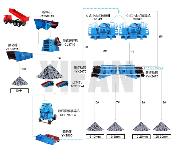 我國(guó)玄武巖資源眾多,因地而異。因此在配置設(shè)備時(shí),要把方案的耐磨性性放在主要位置。 以200mm以下玄武巖為例:物料在原料倉(cāng)經(jīng)由給料機(jī)、皮帶機(jī)輸送至1#振動(dòng)篩進(jìn)行預(yù)篩分,大于40mm的物料進(jìn)入圓錐破進(jìn)行破碎,5-40mm的進(jìn)入立式?jīng)_擊破碎機(jī)進(jìn)行破碎,0-5mm的進(jìn)入洗砂機(jī)清洗后直接出成品。圓錐破破碎后的產(chǎn)品上2#振動(dòng)篩篩分,大于40mm的返回圓錐破重新破碎,形成閉路循環(huán),小于40mm的進(jìn)入立式?jīng)_擊破破碎。立式?jīng)_擊破出來(lái)的料上3#振動(dòng)篩篩分,大于20mm的返回立式?jīng)_擊破進(jìn)行破碎,形成閉路循環(huán),小于20mm的物料經(jīng)由皮帶機(jī)輸送至成品料堆,根據(jù)原料的潔凈程度可考慮將0-5mm的物料送至洗砂機(jī)清洗。